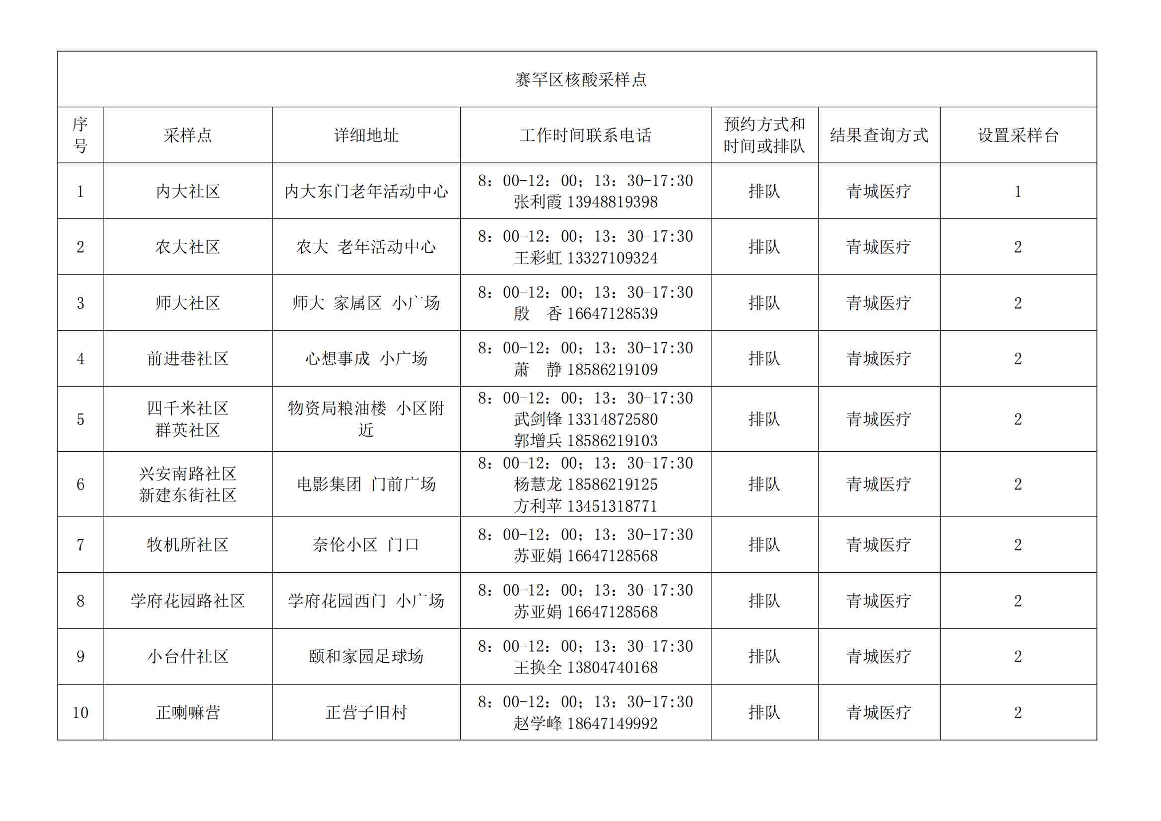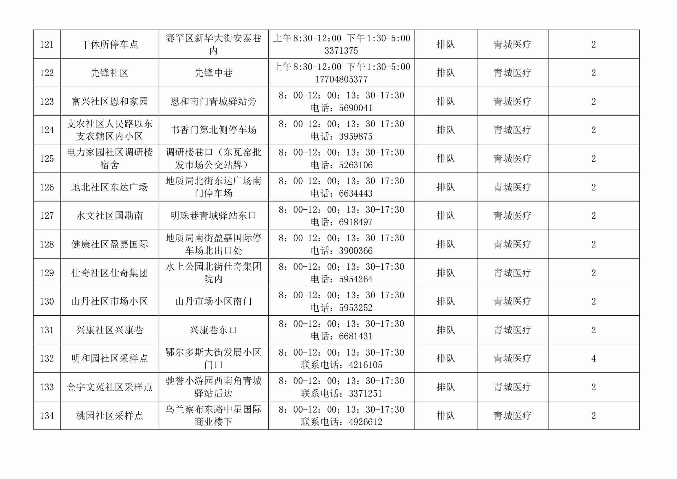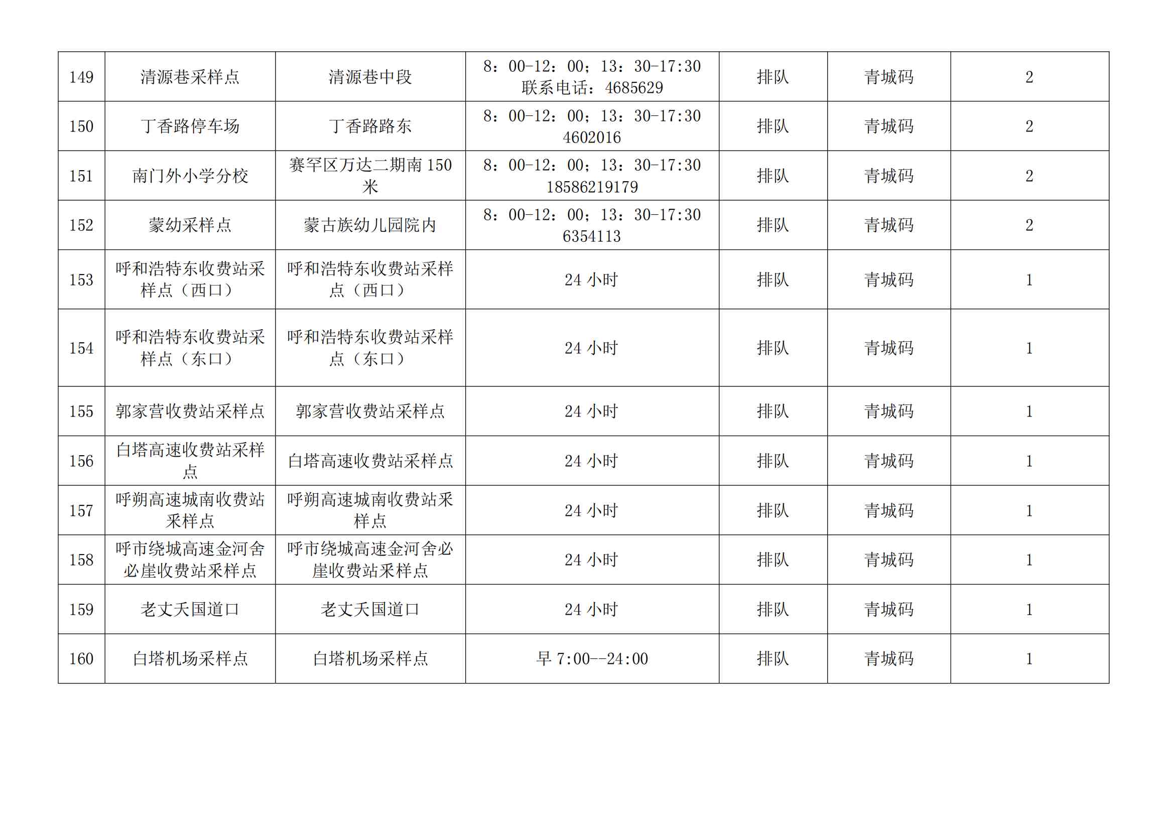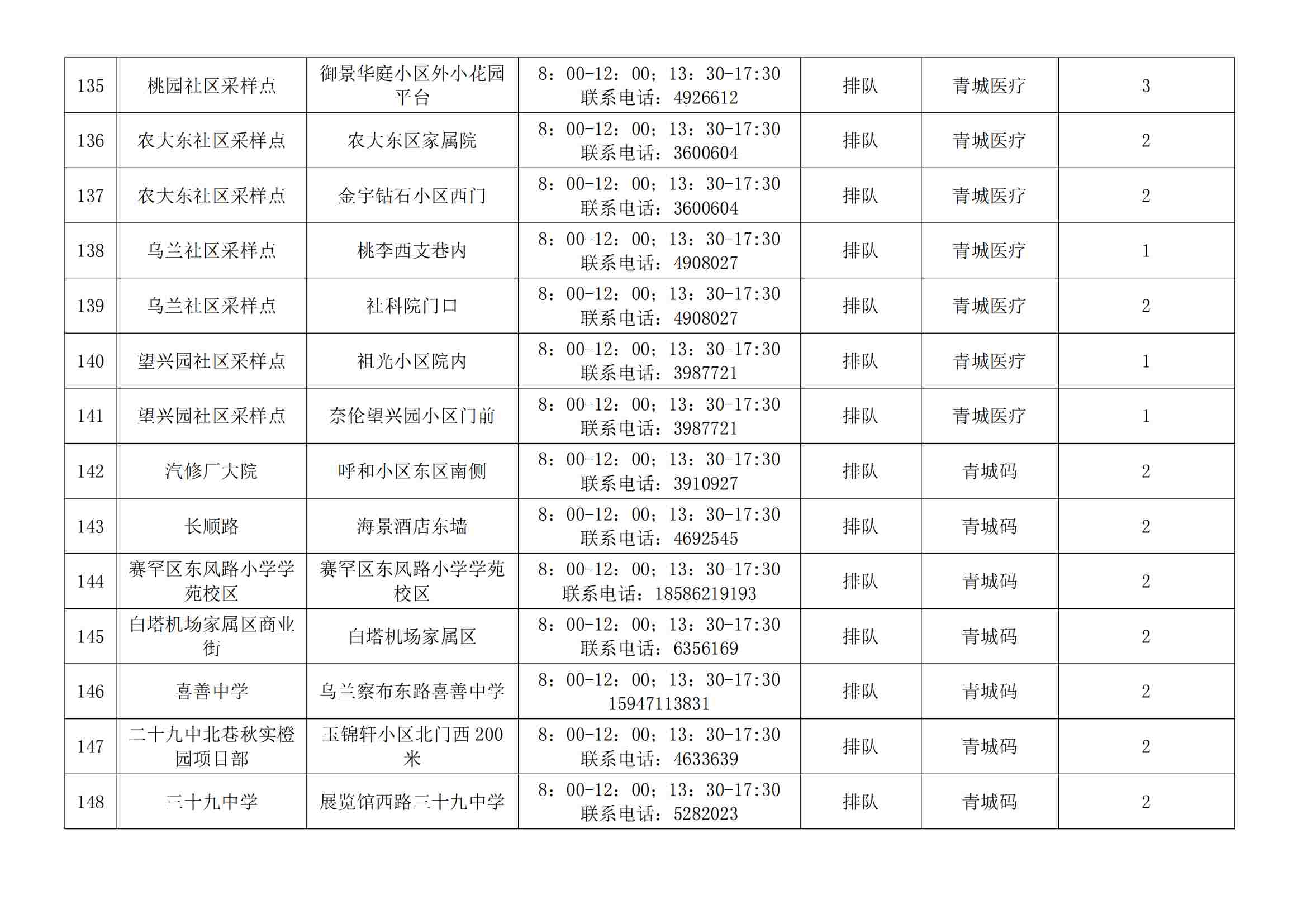 根據(jù)全市核酸檢測政策的調(diào)整,為滿足市民就醫(yī)、出行、工作等核酸檢測需求,賽罕區(qū)開放160個便民核酸采樣點(diǎn)(詳見附表),廣大市民可就近選擇,核酸結(jié)果從青城碼查詢。