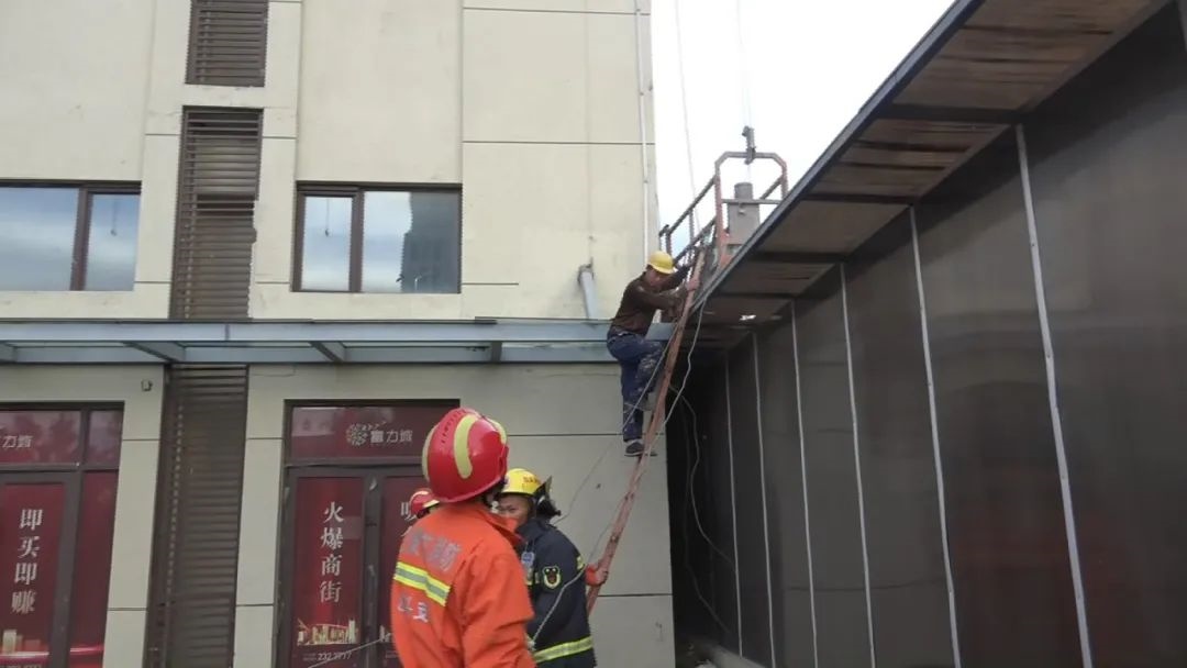 指揮員立即命令第一營救小組前往建筑內部,試圖通過住戶窗戶進行營救,當營救小組到達指定位置后發(fā)現(xiàn),消防隊員與被困工人相距太遠,空中營救的危險性和困難程度較高。消防隊員通過與被困工人交流,提醒他抓好繩索,安撫他的情緒。很快,第二組營救的消防隊員利用掛鉤梯爬到二層位置把纏繞的鋼絲繩拉到地面,4人分別拽一根鋼絲繩,松解纏繞的鋼絲繩,使升降機恢復運行。而此時,天氣逐漸放晴,風力也開始減弱,在消防隊員們的努力下,升降機緩緩下降,18時12分,被困的工人安全降落到地面。