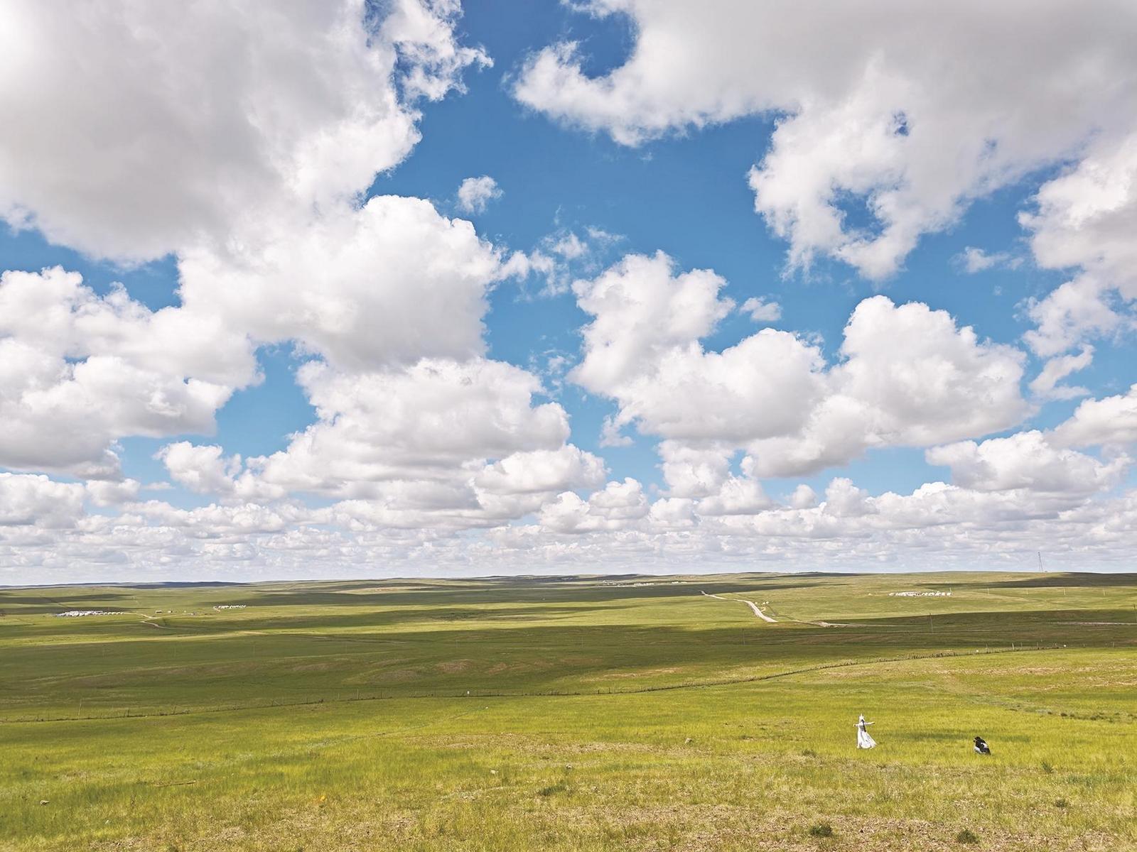 藍(lán)天、白云、大草原。