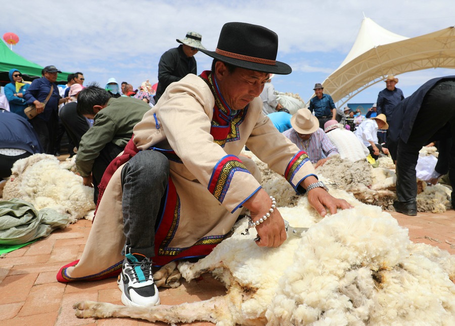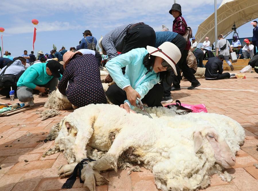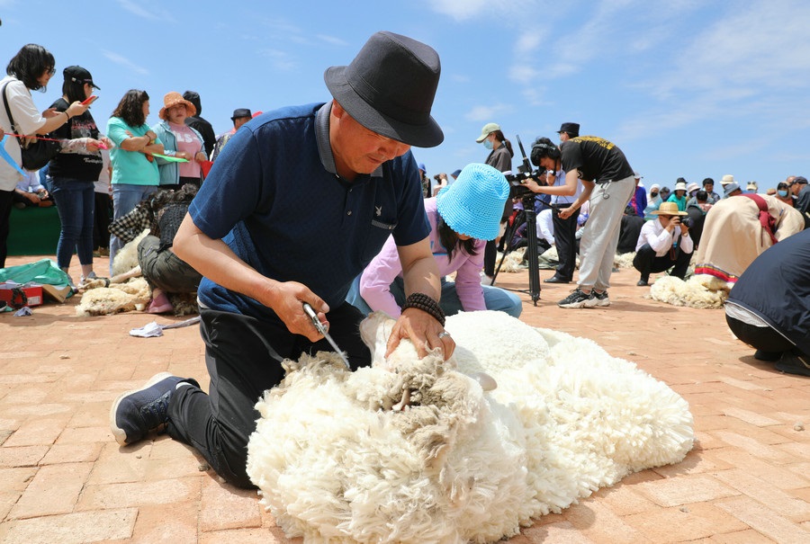 在同步舉行的剪羊毛大賽中,參賽選手們用剪刀和電動剪毛機,在細毛羊身上翻飛操作,牧民們熟練的身手和精湛的技藝,使一只只羊片刻之間“脫胎換骨”。