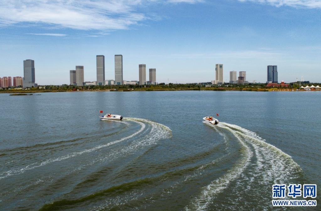 10月14日,游人在伊金霍洛旗東紅海子乘快艇游覽(無人機(jī)照片)。
