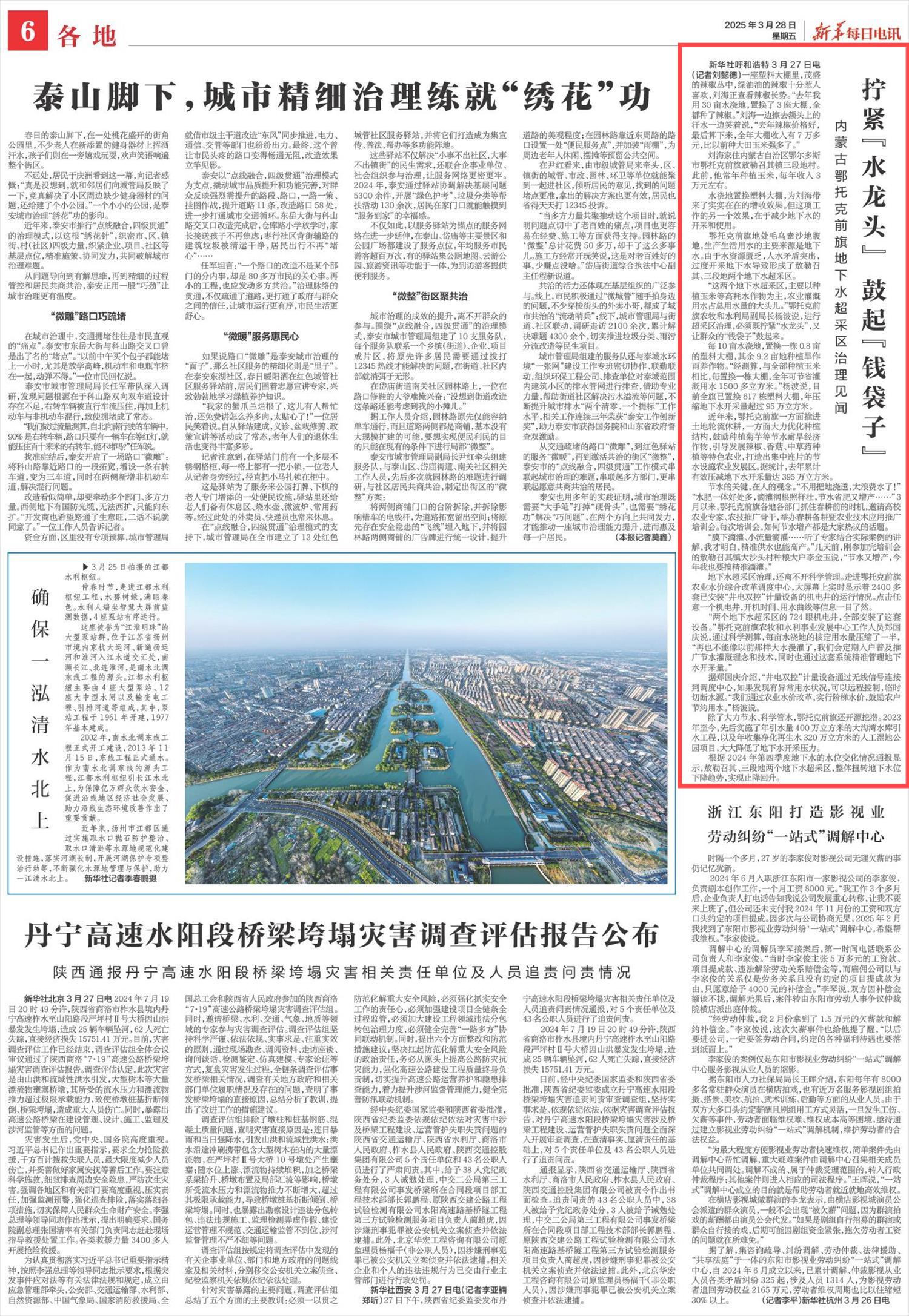 2025年3月28日,《新華每日電訊》第6版刊發(fā)題為《擰緊“水龍頭” 鼓起“錢袋子”》的文章,報道了內(nèi)蒙古鄂托克前旗通過水澆地置換大棚、推廣節(jié)水作物及滴灌技術(shù),不僅使農(nóng)戶收入增長,還減少了地下水的開采和使用。根據(jù)2024年第四季度地下水的水位變化情況通報顯示,敖勒召其、三段地兩個地下水超采區(qū),整體扭轉(zhuǎn)地下水位下降趨勢,實現(xiàn)止降回升。