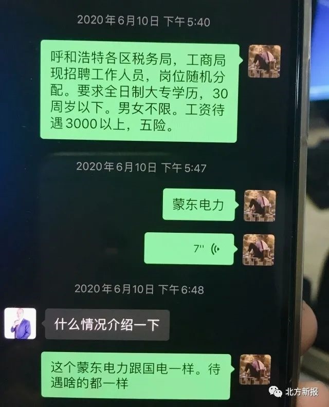“呼和浩特各區(qū)消防大隊招聘辦公室內(nèi)勤人員,工資待遇3500元左右?!薄案咚俳痪羰兄ш?一支隊)輔警,工資和五險一金,4200元?!薄昂艉秃铺馗鲄^(qū)稅務(wù)局、工商局現(xiàn)招聘工作人員,崗位隨機分配?!薄昂艉秃铺貗D幼保健院招聘護士,大專學(xué)歷”……記者在民警繳獲的程某某的手機上看到,6月8日以來,程某某和趙某某的聊天記錄中,發(fā)送了多條諸如此類的招聘信息。