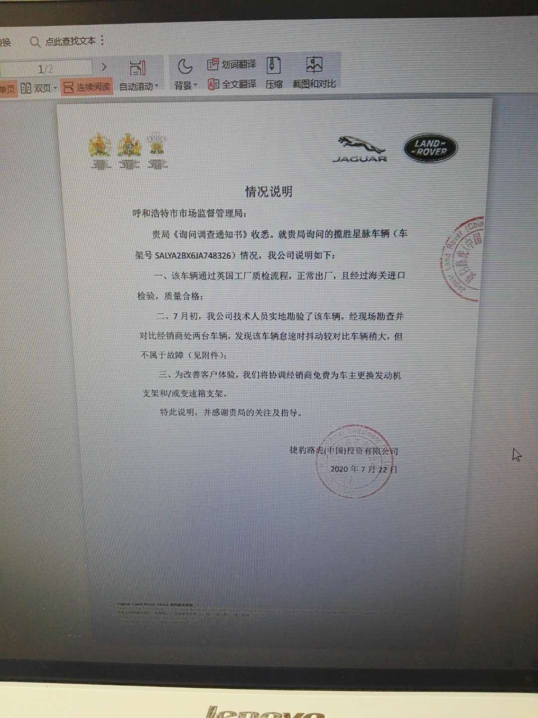 今年5月初,李女士將此事投訴到了呼和浩特市市場監(jiān)督管理局。經(jīng)執(zhí)法人員調(diào)查,李女士反映的情況屬實。隨后,在執(zhí)法人員的關(guān)注下,路虎總部還派人來查看該車輛,但是堅稱該車沒有質(zhì)量問題。此后,該局向路虎總部發(fā)出了《詢問調(diào)查通知書》。7月22日,捷豹路虎(中國)投資有限公司向該局回函稱:“1.該車通過英國工廠質(zhì)檢流程,正常出廠,而且經(jīng)過海關(guān)進(jìn)口檢驗,質(zhì)量合格。2.7月初,我公司技術(shù)人員實地勘驗了該車輛,經(jīng)現(xiàn)場勘察并且對比經(jīng)銷商(順馳路捷)處兩臺車輛,發(fā)現(xiàn)該車輛怠速時抖動較對比車輛稍大,但不屬于故障。3.為改善客戶體驗,我們將協(xié)調(diào)經(jīng)銷商免費為車主更換發(fā)動機(jī)支架和/或變速箱支架?!?/p>