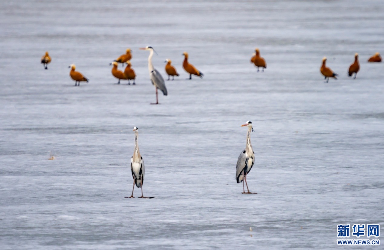 在土默特左旗海流水庫冰面上,候鳥在悠閑覓食。新華網(wǎng)發(fā)(陽光 攝)