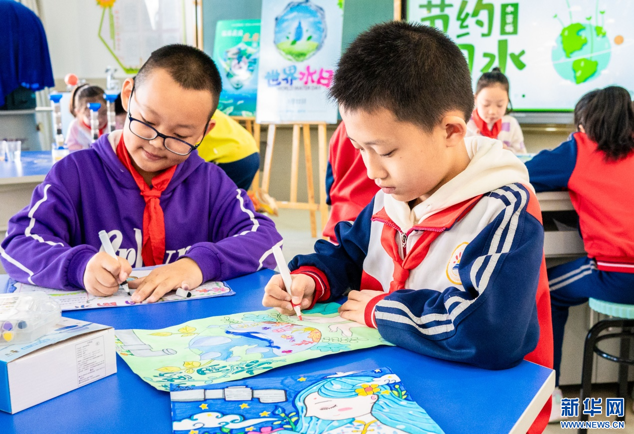 ??3月20日,呼和浩特市玉泉區(qū)石東路小學(xué)學(xué)生在繪制愛水護(hù)水兒童畫。新華網(wǎng)發(fā)(丁根厚 攝)