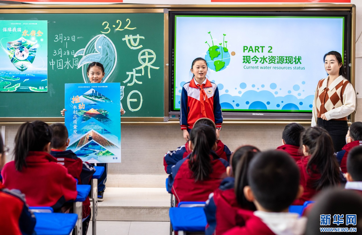 ??3月20日,呼和浩特市玉泉區(qū)石東路小學(xué)學(xué)生在班隊(duì)會上分享節(jié)水小妙招。新華網(wǎng)發(fā)(丁根厚 攝)