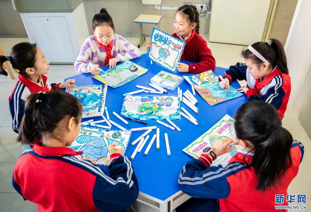 ??3月20日,呼和浩特市玉泉區(qū)石東路小學(xué)學(xué)生在繪制以“節(jié)約用水 從我做起”為主題的手抄報(bào)。新華網(wǎng)發(fā)(丁根厚 攝)