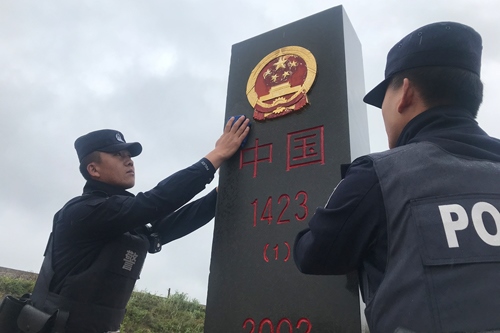 9月18日上午,內(nèi)蒙古額布德格邊境派出所民警在巡邊途中,擦拭沿途界碑,以獨(dú)有的方式向?yàn)閲?guó)捐軀的英雄們致以崇高敬意。