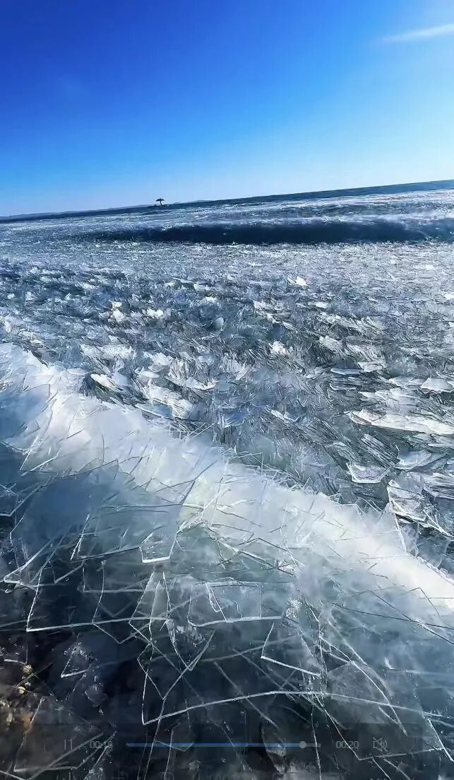 在無人機(jī)航拍視角下,2239.9平方公里的湖面上,冰排與未完全封凍的水域交織分布,白色冰體與湛藍(lán)湖水相映,宛如大地鋪展的巨型碧玉上鑲嵌的銀紋。靠近湖中心的區(qū)域,新凍結(jié)的冰層還呈現(xiàn)出細(xì)膩的冰花紋路,而岸邊的冰排群中,隱約可見因地下泉眼涌動形成的“清眼”,表面覆著薄霜,在陽光下泛著微光。