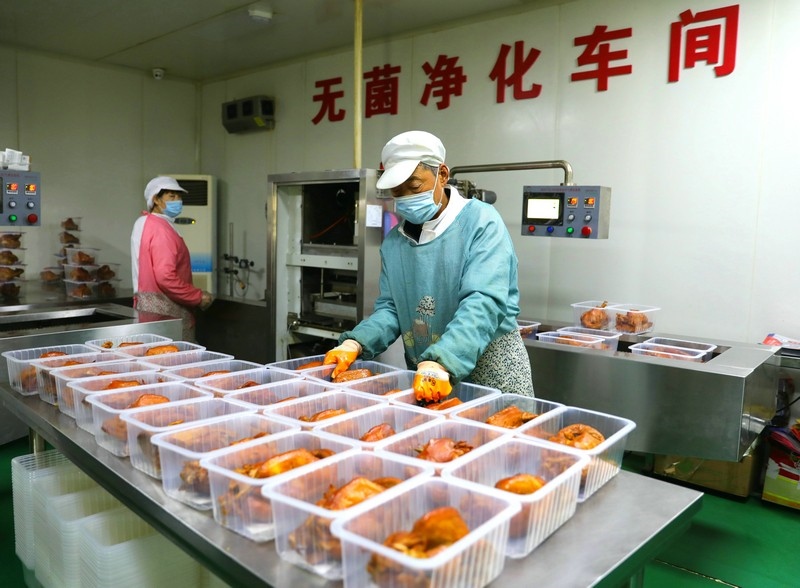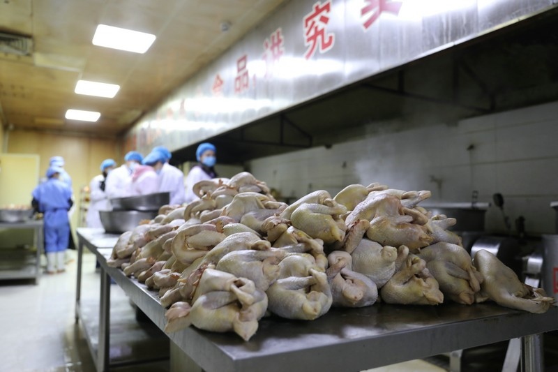 當日上午,媒體團成員進入加工車間實地了解熏雞、熏蛋、熏肉等特色產(chǎn)品生產(chǎn)加工過程。據(jù)了解,卓資縣的熏雞每年銷量約為400萬只,產(chǎn)值2個億,帶動了當?shù)厝罕娒撠氈赂?,是真正的富民強縣產(chǎn)業(yè)。目前,卓資熏雞在繼承傳統(tǒng)工藝的基礎上,引進鎖鮮包裝,使熏雞保鮮期由原來的7天增加到15天,并進入電商平臺面向全國銷售。