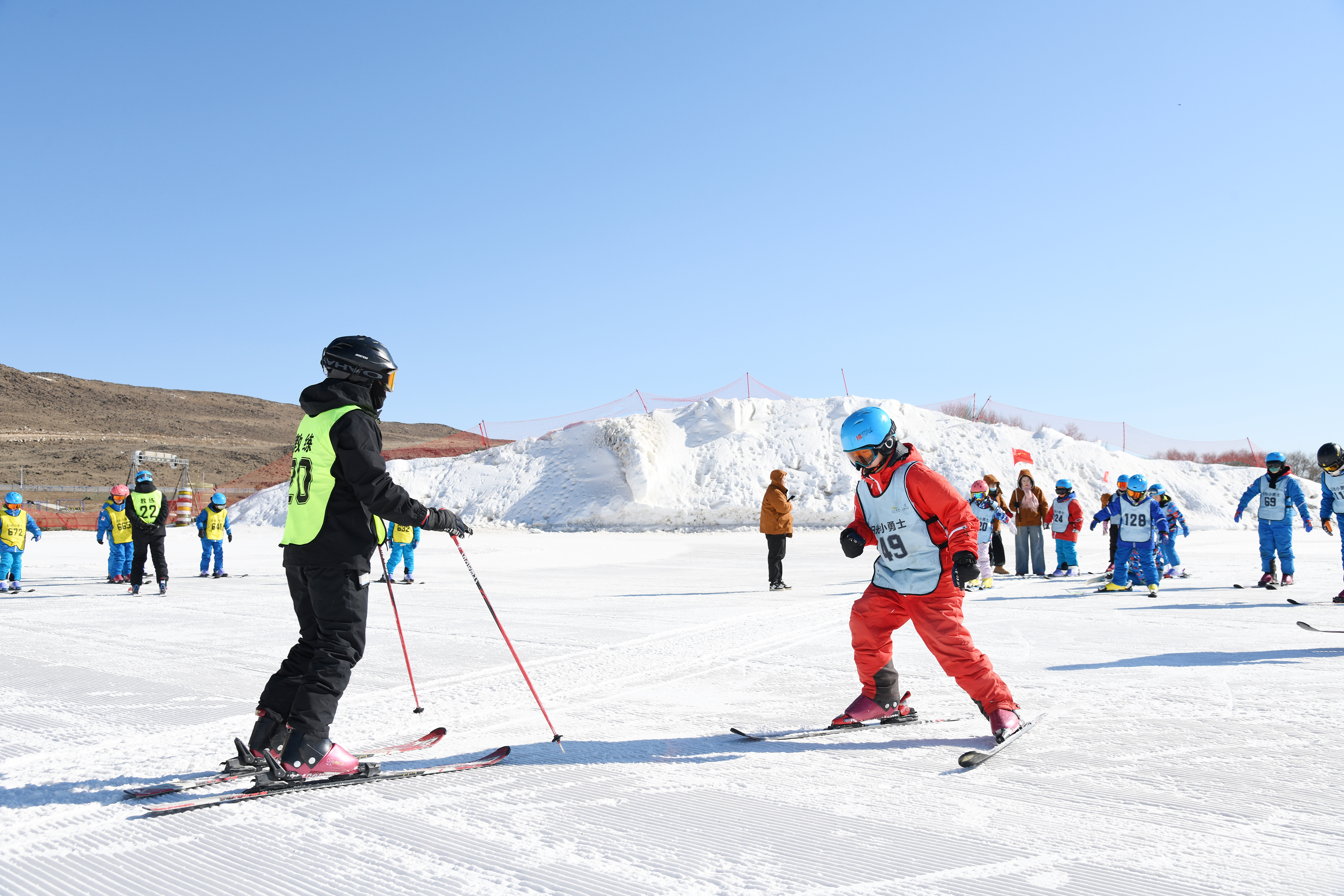 “把腳尖對準雪板凹槽,腳后跟用力下踩?!薄半p腿呈‘V’字形,與肩同寬,掌握好平衡?!倍顮I學(xué)員在烏蘭察布日光火山大河灣滑雪度假區(qū)專業(yè)教練的悉心指導(dǎo)下,從最基礎(chǔ)的穿戴裝備學(xué)起,逐漸掌握了犁式轉(zhuǎn)彎、半犁式轉(zhuǎn)彎等技巧。經(jīng)過一個多小時的學(xué)習(xí)和鍛煉,有一定基礎(chǔ)的學(xué)員已經(jīng)可以在雪道上腳踏雪板飛馳而下,并流暢地完成大回轉(zhuǎn)等動作;有的學(xué)員偶爾摔倒,也會迅速起身繼續(xù)訓(xùn)練。
