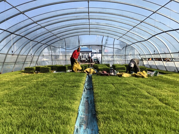 水稻種植戶將秧苗擺放在編織袋上,等待無人機(jī)運(yùn)送