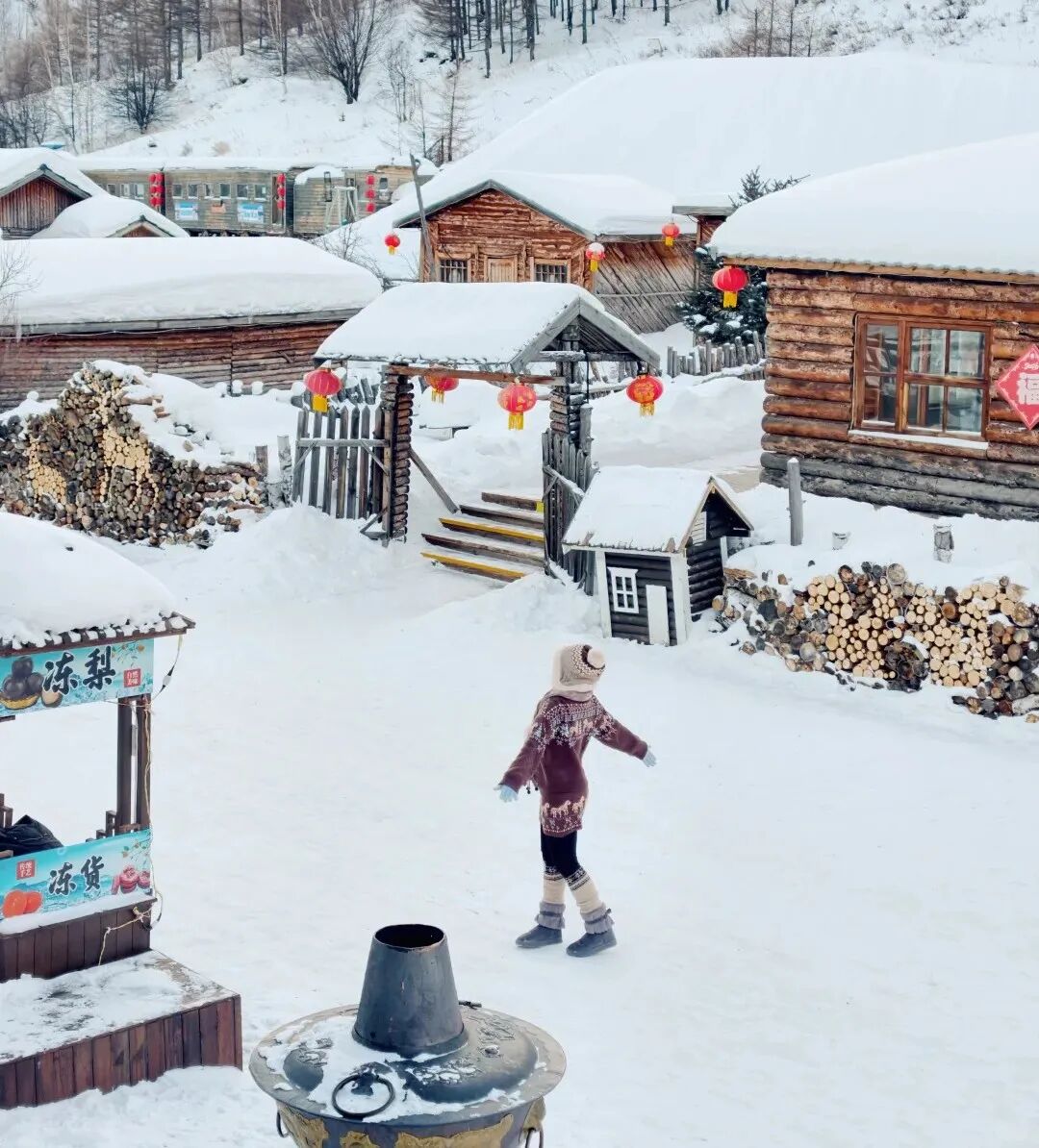 登上白狼峰觀景臺,俯瞰一望無際的林海雪原,夕陽西下時,整片雪原被染成溫柔的金色,寒風(fēng)掠過,雪花漫舞,這一刻的壯闊,足以治愈所有煩惱。走進(jìn)阿爾山雪村,木刻楞房頂著圓滾滾的“雪蘑菇”,紅燈籠在白雪中搖曳,晚上燈光一亮,暖黃色的光灑在雪上,感覺自己在童話里 。