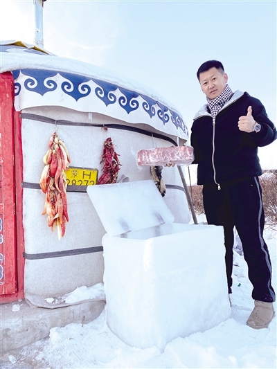 12月8日,記者幾經(jīng)周折與視頻中的小伙張智磊取得了聯(lián)系。張智磊今年36歲,從小在錫林郭勒大草原長大,在當(dāng)?shù)刂饕雠Q蛉馍狻τ谝馔庾呒t,張智磊直言自己也沒有想到。“視頻是在錫林浩特市南郊向陽村叔叔家院子里的蒙古包拍攝的。記得小時(shí)候,每到冬天,周邊牧民都是把食物埋在雪地里儲存。我前幾天也拍了一個(gè)從雪地里找羊腿的視頻,有粉絲留言‘放在雪地里會不會忘記位置容易丟了’,然后我就突發(fā)奇想,干脆做個(gè)‘冰箱’把年貨放進(jìn)去?!睆堉抢诟嬖V記者,他從12月3日開始凍冰塊,12月4日把凍結(jié)實(shí)的冰塊拿出來用冷水黏合,因?yàn)楸鶋K低于0攝氏度,遇水就會瞬間黏在一起,然后開始著手打磨,棱棱角角都用電熨斗熨平整,再加上蓋,一個(gè)“冰箱”就完成了。