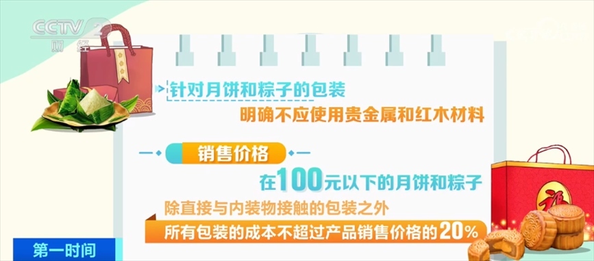 針對月餅和粽子的包裝,明確不應使用貴金屬和紅木材料;銷售價格在100元以下的月餅和粽子,除直接與內(nèi)裝物接觸的包裝之外,所有包裝的成本不超過產(chǎn)品銷售價格的20%;售價在100元以上的,包裝成本不超過產(chǎn)品銷售價格的15%。