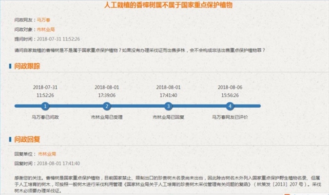 2018年7月,馬萬春通過網(wǎng)絡(luò)問政,得到的瀘州市林業(yè)局的答復。圖片來源/受訪者供圖