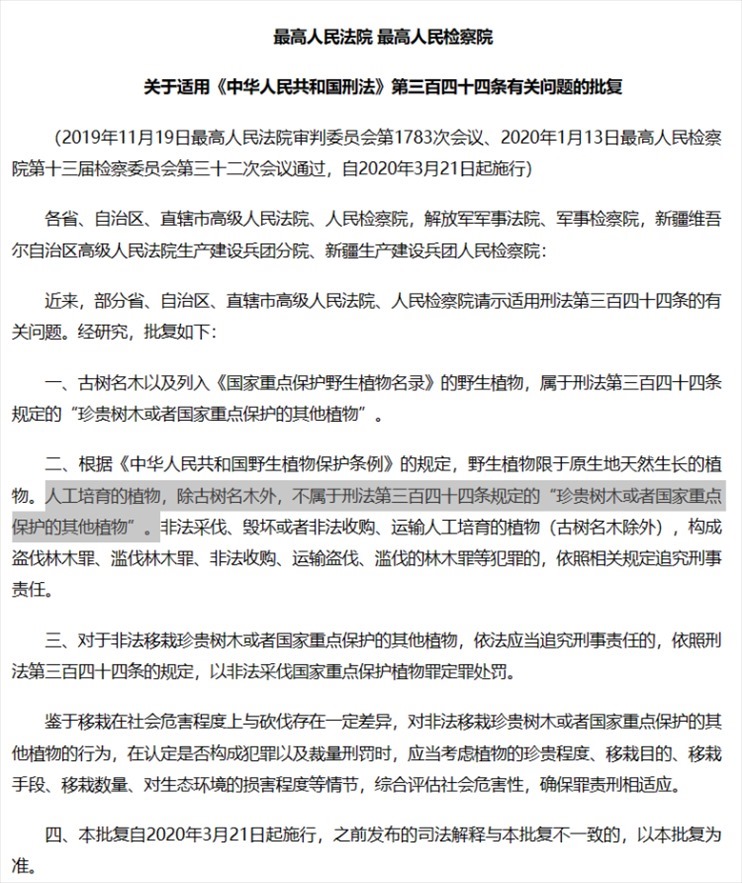 2020年3月,兩高批復明確“人工培育的植物,除古樹名木外,不屬于刑法第三百四十四條規(guī)定的‘珍貴樹木或者國家重點保護的其他植物’”。圖片來源/網(wǎng)頁截屏