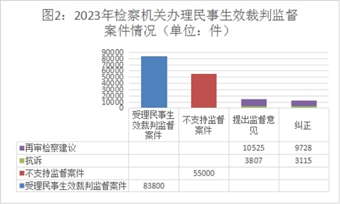 2023年,全國檢察機關(guān)始終堅持以習近平新時代中國特色社會主義思想特別是習近平法治思想為指導,認真貫徹落實《中共中央關(guān)于加強新時代檢察機關(guān)法律監(jiān)督工作的意見》,以“高質(zhì)效辦好每一個案件”作為履職辦案的基本價值追求,以專業(yè)化建設(shè)為基礎(chǔ),以提升辦案能力和水平為目標,認真貫徹實施民法典,扎實推進民事生效裁判監(jiān)督、審判活動監(jiān)督、執(zhí)行活動監(jiān)督、支持起訴、虛假訴訟監(jiān)督等各項工作,在完善案卷調(diào)閱制度、民事再審檢察建議制度、促進社會治理等方面取得新進展新成效。