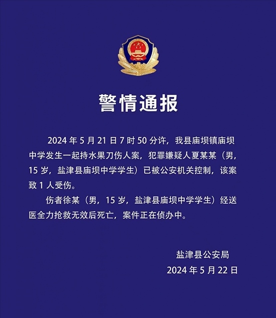 央視網(wǎng)消息:云南鹽津縣公安局通報,5月21日7時50分許,鹽津縣廟壩鎮(zhèn)廟壩中學(xué)發(fā)生一起持水果刀傷人案,犯罪嫌疑人夏某某(男,15歲,鹽津縣廟壩中學(xué)學(xué)生)已被公安機(jī)關(guān)控制,該案致1人受傷。傷者徐某(男,15歲,鹽津縣廟壩中學(xué)學(xué)生)經(jīng)送醫(yī)全力搶救無效后死亡,案件正在偵辦中。