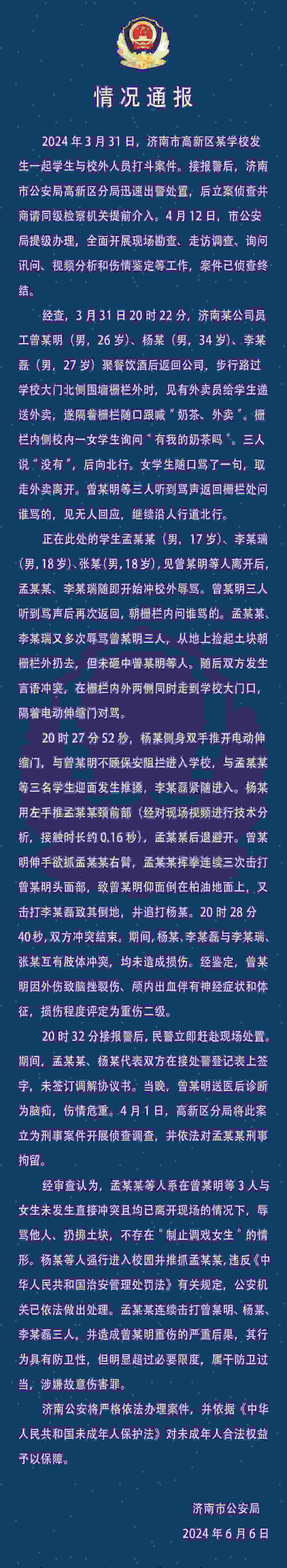 學生與醉漢沖突、被拘留 濟南警方:涉事學生屬于防衛(wèi)過當