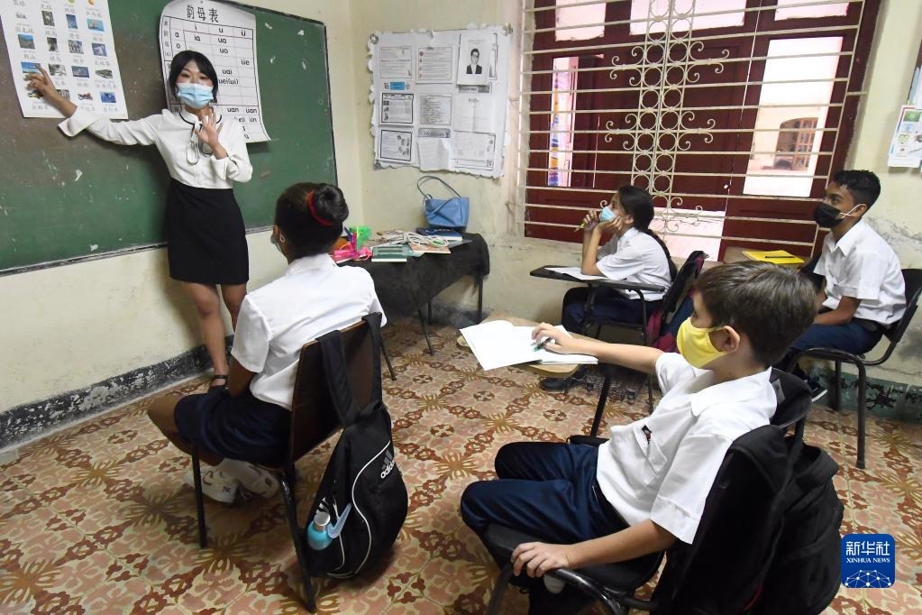 3月7日,中國教師侯嘉琪(左一)在古巴首都哈瓦那的羅德里格斯中學為學生上中文課。