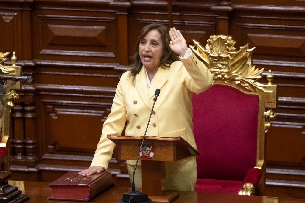2022年12月7日,在秘魯利馬,迪娜·博盧阿特在國(guó)會(huì)宣誓就任總統(tǒng)。新華社發(fā)(瑪利亞娜·巴索攝)