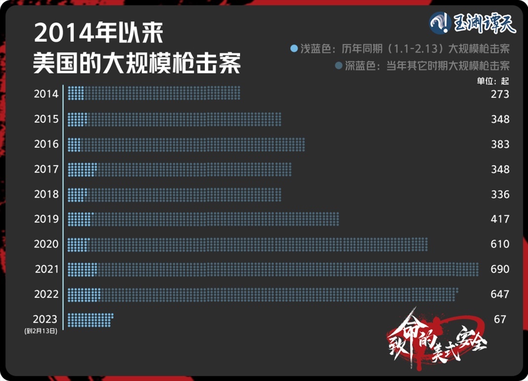 2023年開(kāi)年到現(xiàn)在,美國(guó)的大規(guī)模槍擊案數(shù)量創(chuàng)下歷史同期新高。到2月13日,美國(guó)已經(jīng)發(fā)生了67起大型槍擊案,也就是說(shuō),現(xiàn)在的美國(guó),平均每天至少要發(fā)生一起大規(guī)模槍擊案。在此期間,F(xiàn)BI飽受詬病,甚至被稱(chēng)為美國(guó)槍擊案的間接推手。