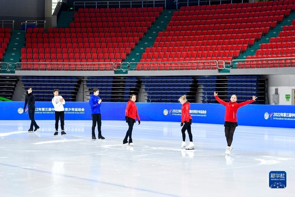 在長春五環(huán)體育館,參加第三屆中俄冬季青少年運(yùn)動(dòng)會的俄羅斯花樣滑冰運(yùn)動(dòng)員在賽前場地適應(yīng)性訓(xùn)練時(shí)向場邊的中國運(yùn)動(dòng)員致意(2022年12月15日攝)。新華社記者 許暢 攝