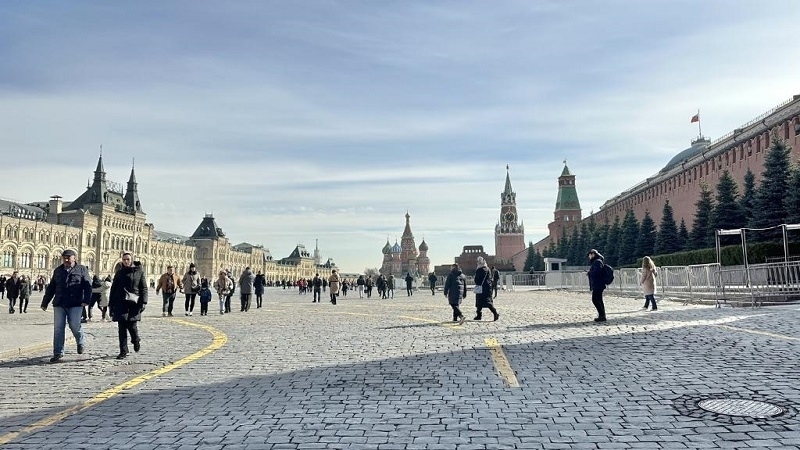 莫斯科紅場上,藍(lán)天白云,很多市民趁著好天氣外出游玩。