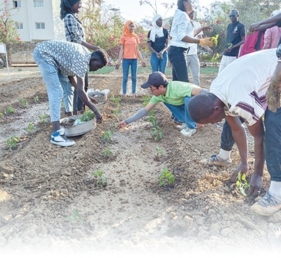 達(dá)喀爾大學(xué)校園里,塞內(nèi)加爾學(xué)生跟著中國(guó)老師學(xué)習(xí)移栽辣椒苗。中國(guó)援塞內(nèi)加爾農(nóng)技專家組供圖