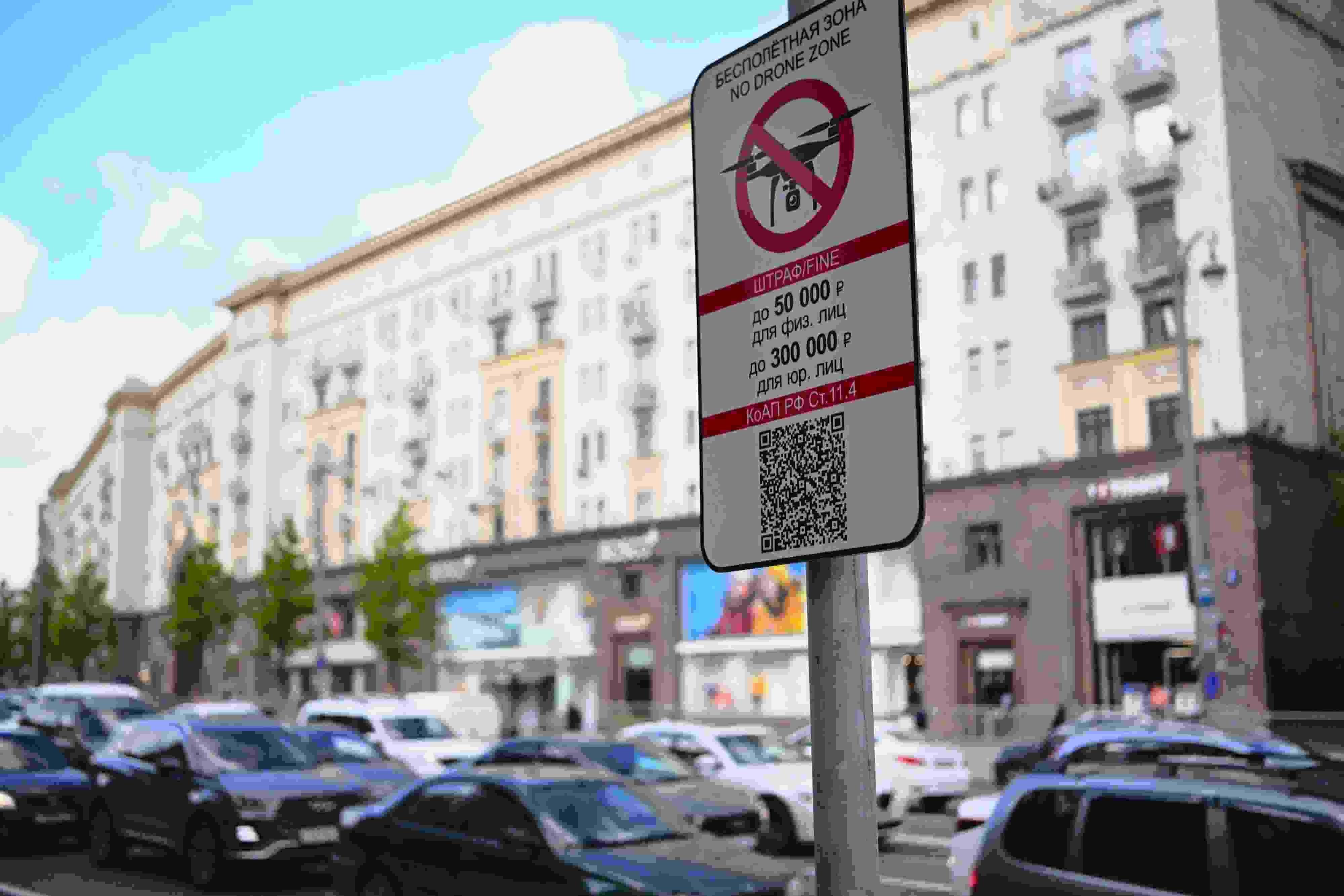 當(dāng)?shù)貢r間2023年5月3日,俄羅斯莫斯科,莫斯科市中心懸掛的“無人駕駛飛機禁飛區(qū)”的標(biāo)志,禁止無人機在該地區(qū)飛行??死锬妨謱m遭無人機襲擊后,莫斯科市長宣布禁止未經(jīng)授權(quán)的無人機在俄羅斯首都上空飛行。 視覺中國