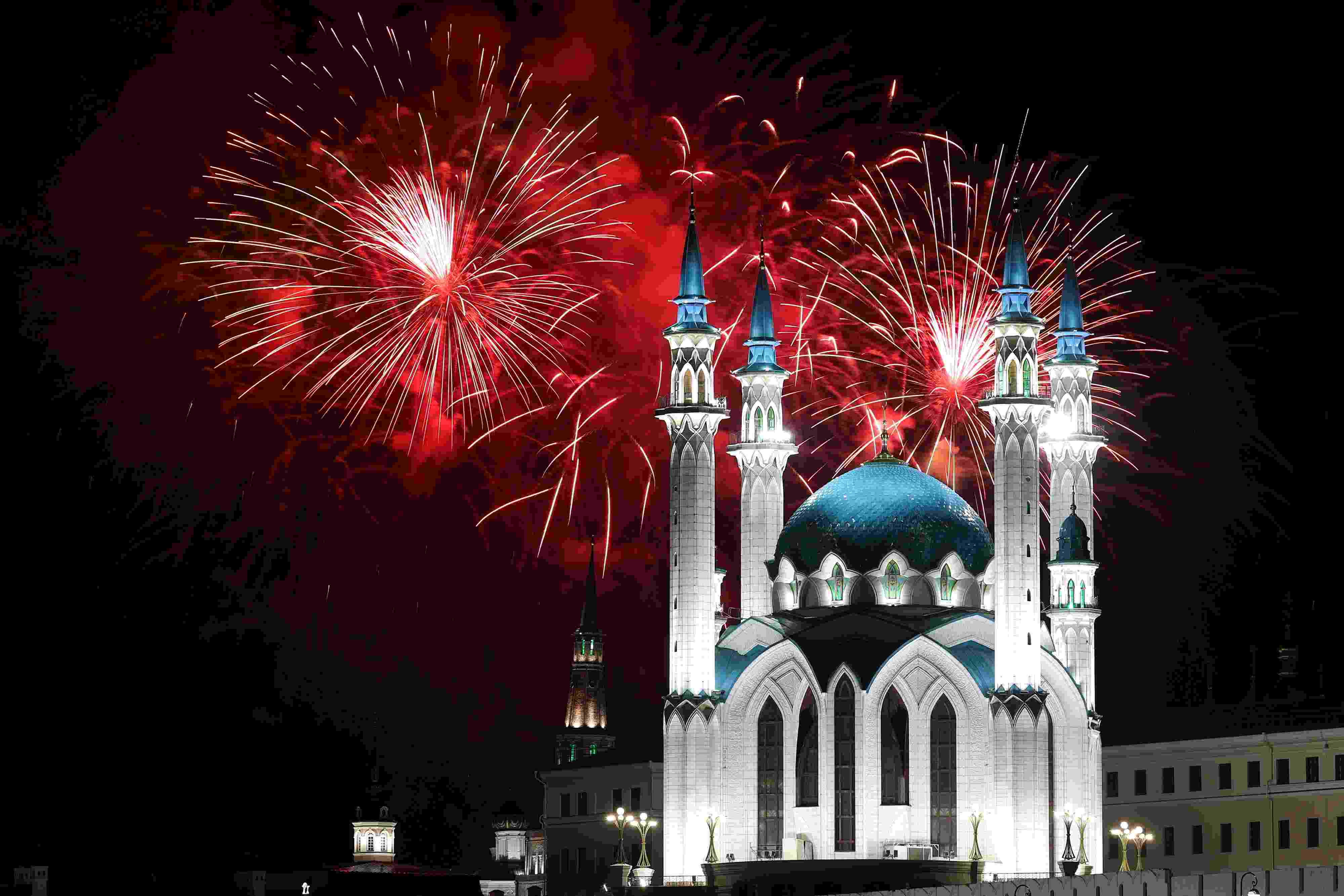 當(dāng)?shù)貢r間2023年5月9日,俄羅斯喀山,紀(jì)念衛(wèi)國戰(zhàn)爭勝利78周年,庫爾沙里夫清真寺燃放煙花。視覺中國