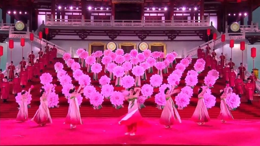 紫云樓前,禮樂(lè)和鳴,明快有力的古代佾舞、絢麗婀娜的芙蓉花舞,表達(dá)了古都西安人民的熱情好客,體現(xiàn)了中華文化兼容并蓄的精神風(fēng)貌。