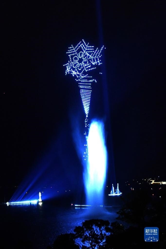 當晚,無人機光影音樂秀在瑞士日內(nèi)瓦湖上舉行,超過1350架無人機點亮夜空,吸引市民駐足觀看。新華社記者 連漪 攝