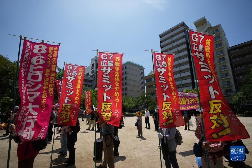 5月21日,民眾聚集在日本廣島袋町公園,抗議七國(guó)集團(tuán)峰會(huì)。   新華社記者 張笑宇 攝