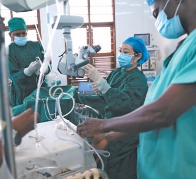 第三十二期中國(guó)援坦桑尼亞桑給巴爾醫(yī)療隊(duì)的眼科醫(yī)生與當(dāng)?shù)蒯t(yī)生一起做術(shù)前準(zhǔn)備。 新華社記者 董江輝攝
