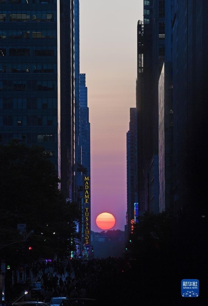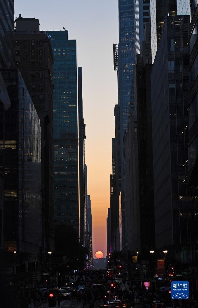 當(dāng)日,紐約出現(xiàn)“曼哈頓懸日”景觀?!奥D懸日”是紐約市標(biāo)志性景觀,每年5月和7月出現(xiàn)兩次,指日落時(shí)太陽正好出現(xiàn)在曼哈頓東西向街道正上方、似乎懸在兩側(cè)高樓大廈之間的戲劇性畫面。新華社記者 李睿 攝