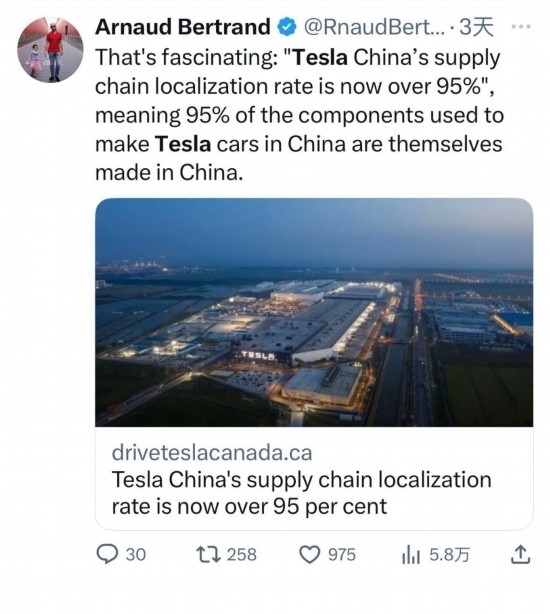 貝特朗還常為中國(guó)發(fā)展“點(diǎn)贊”。他在轉(zhuǎn)發(fā)特斯拉上海超級(jí)工廠新聞時(shí)由衷贊嘆:“真是太厲害了,這表示在中國(guó)生產(chǎn)特斯拉汽車所用的95%的零部件都是中國(guó)制造?!保▍⑴c記者:陳紹華、張曼;視頻:淡然、王沛;編輯:魯豫、王豐豐、杜逾舸、孫浩)