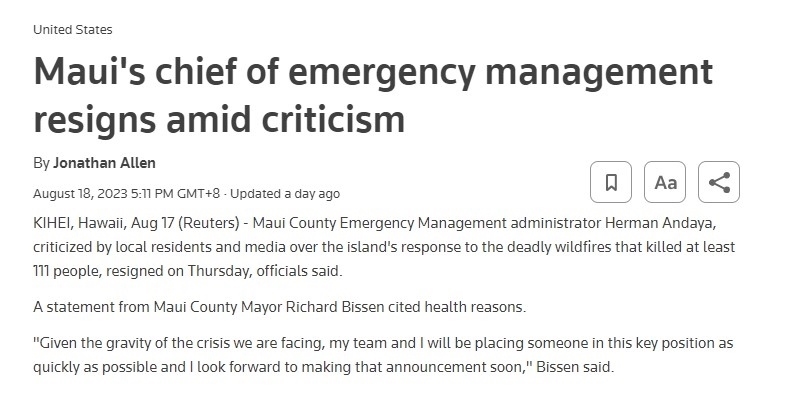 路透社8月18日報道,毛伊縣緊急事務(wù)管理機構(gòu)負責人赫爾曼·安達亞在當?shù)鼐用窈兔襟w的一片“救災(zāi)不利”的譴責聲中辭職。截至17日,致命山火已經(jīng)造成至少111人死亡。一些毛伊島居民認為,如果能更早拉響警報,會挽救更多生命。