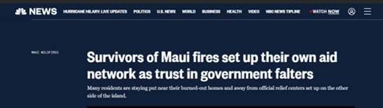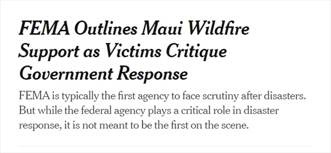 《紐約時報》8月14日報道,聯(lián)邦緊急事務(wù)管理局要求人們在網(wǎng)站上注冊后才能獲得臨時住房等援助,但是毛伊島西部受災(zāi)最嚴重地區(qū)目前依然處于斷電斷網(wǎng)中,那里的災(zāi)民根本無法登錄網(wǎng)站。