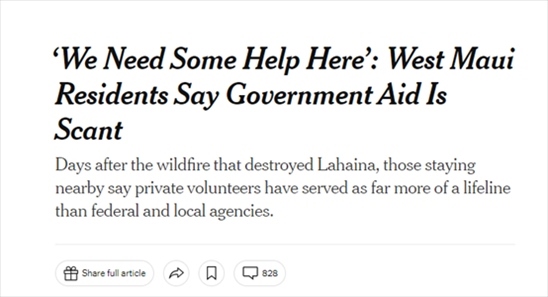 《紐約時報》8月13日發(fā)表報道稱,毛伊島野火造成2200多幢建筑倒塌,許多受災(zāi)居民缺少熱食、飲用水和庇護所。災(zāi)難發(fā)生后,當?shù)刂驹刚呓M成了比聯(lián)邦和地方機構(gòu)更可靠的“生命線”。有居民表示,從聯(lián)邦和地方政府手中得到的救助遠沒有從私人志愿者處得到的多。