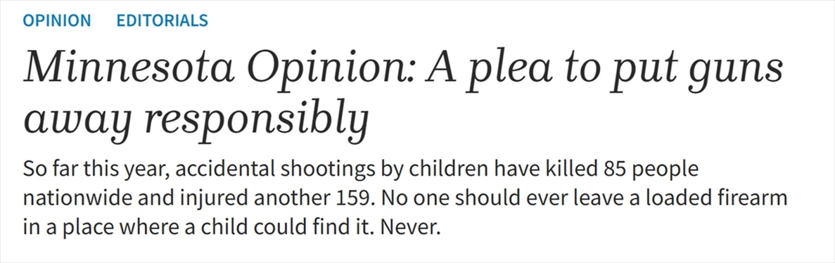 報(bào)道指出,這樣的數(shù)據(jù)駭人聽(tīng)聞,由于成年槍支擁有者的疏忽大意,太多孩子的童年被迫縮短,幸存下來(lái)的人的生活也不可挽回地遭到破壞。任何人都不應(yīng)該把上了膛的槍支留在兒童能夠找到的地方,絕對(duì)不可以。