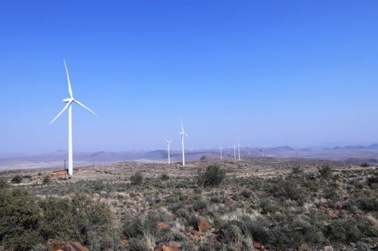 這是8月10日在南非北開普省德阿鎮(zhèn)拍攝的龍源南非公司德阿風(fēng)電項目風(fēng)機(jī)。新華社記者 董江輝 攝