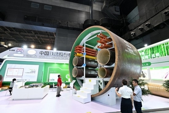 9月2日,在國家體育館舉行的服貿(mào)會(huì)環(huán)境服務(wù)專題展上,客商在中國鐵建展位竹纏繞管廊旁了解信息。新華社記者 李鑫 攝