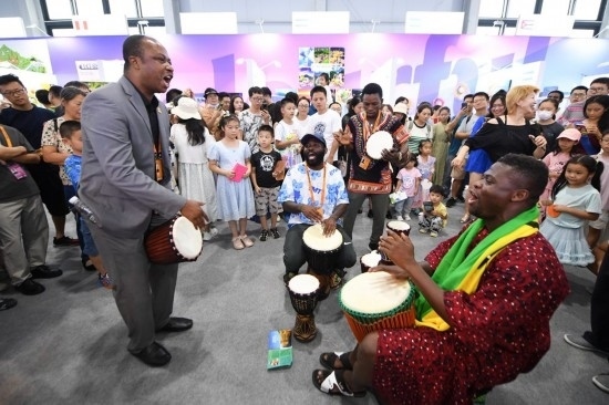 9月2日,在“一帶一路”沿線國家特色文化展示活動(dòng)上,加納共和國駐華大使館展區(qū)的工作人員在現(xiàn)場(chǎng)即興表演。新華社記者 鞠煥宗 攝