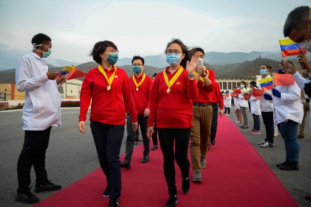 2020年4月11日,在委內(nèi)瑞拉首都加拉加斯,中國抗疫醫(yī)療專家組在授勛儀式結(jié)束后登機回國。新華社發(fā)(薩爾戈多攝)