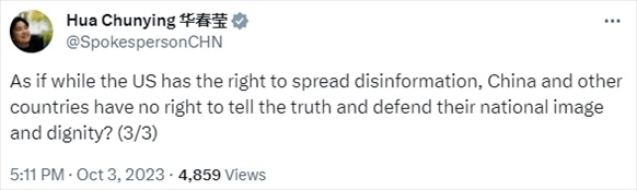 “仿佛美國(guó)有權(quán)利散布虛假信息,而中國(guó)等國(guó)家卻無(wú)權(quán)說(shuō)實(shí)話、維護(hù)國(guó)家形象和尊嚴(yán)?”