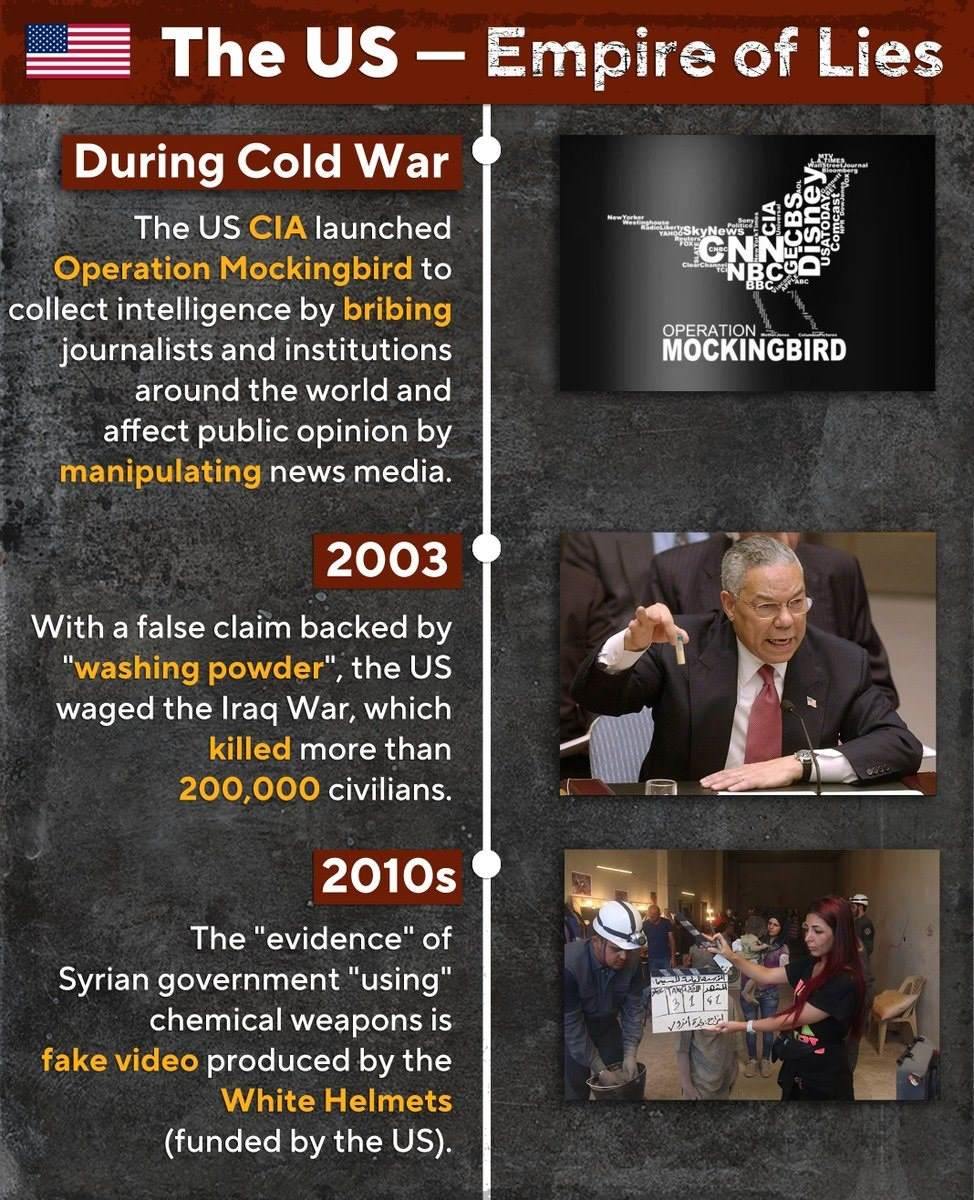 早在冷戰(zhàn)期間,美國(guó)中央情報(bào)局發(fā)起了“知更鳥(niǎo)計(jì)劃”,通過(guò)賄賂世界各地的記者和機(jī)構(gòu)來(lái)收集情報(bào),并通過(guò)操縱新聞媒體來(lái)影響公眾輿論。新世紀(jì)借“洗衣粉”“白頭盔”,美國(guó)對(duì)伊拉克、敘利亞悍然發(fā)動(dòng)侵略戰(zhàn)爭(zhēng),造成數(shù)十萬(wàn)平民死亡。