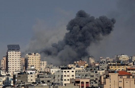 10月12日,加沙城的建筑遭以色列軍隊(duì)空襲后升起濃煙。新華社發(fā)(里澤克·阿卜杜勒賈瓦德攝)